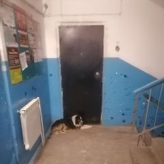 Собака находится по адресу Советская 201 подъезд 4 на 1 этаже, как будто кого то ждет, пол неизвестно