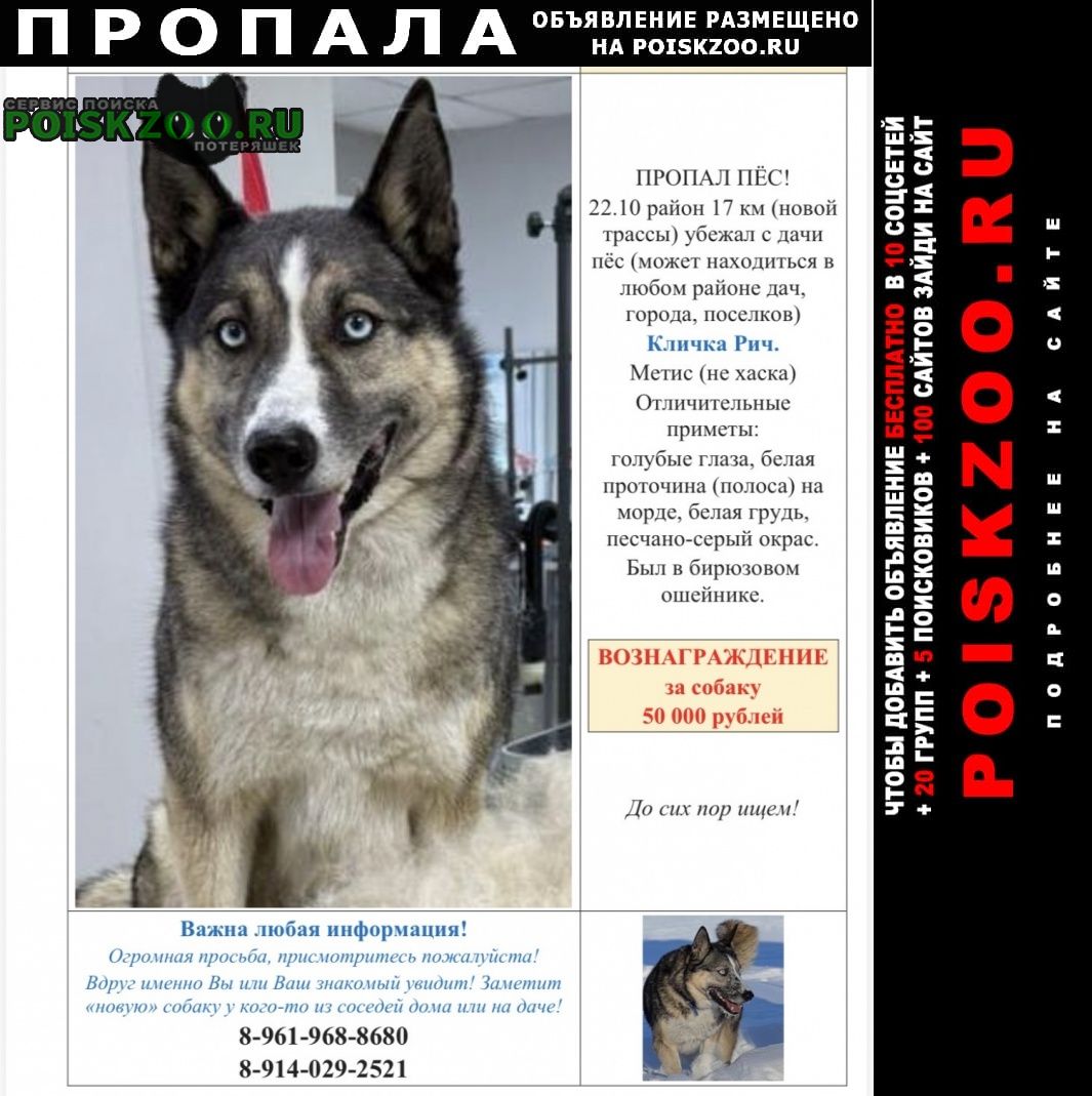 *Разыскивается собака * 22. 10 район 17 км (новой трассы) убежал пёс (может находиться в любом районе дач, города, поселков) Кличка Рич. Метис (лайка, не хаска) Отличительные приметы: голубые глаза, белая проточина (полоса) на морде, белая грудь, песчано-рыжий окрас. Был в бирюзовом ошейнике. За достоверную информацию о его местонахождении (фото) *вознаграждение* при необходимости конфиденциальность) Тел *..*.. Огромная просьба, если увидите, сразу позвонить (задержать), пёс добродушный Вдруг именно Вы или Ваш знакомый/сосед увидит Рича и он вернется домой